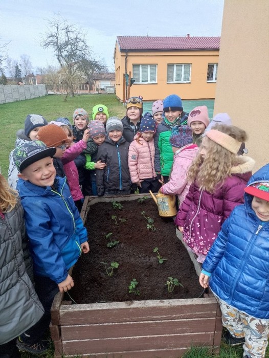 Nejprve si připravíme záhon s jahodami. Už se těšíme, až budeme sklízet.